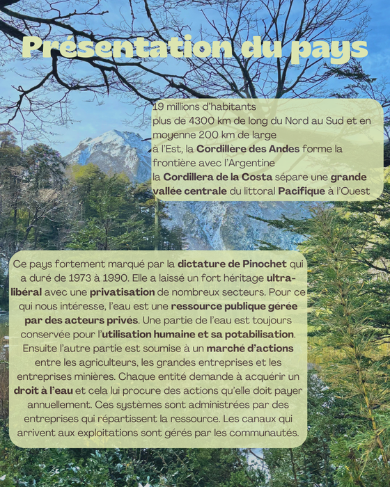 La géographie si particulière de ce pays rend une gestion intégrée et nationale très compliquée. La principale remarque sera le caractère privatif de la ressource hydrique dans ce pays : il y a un véritable marché de l'eau. Comme toujours, le réchauffement climatique perturbe les dynamiques et les précipitations en eau diminue rendant certaines saisons totalement sèches : il y a donc une compétition entre les acteurs pour obtenir des droits d'accès à l'eau, ressource essentielle pour les populations et pour l'économie générale du pays entre industrie et agriculture.